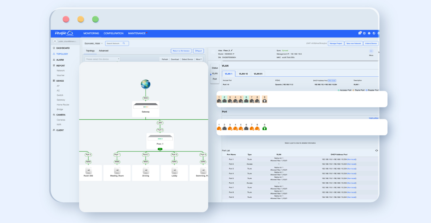 2.Ruijie Networks offers free lifetime service of all Ruijie Cloud basic features for all Ruijie cloud-managed supported networking devices. Ruijie Networks reserves the right to charge for advanced features in the future. The service scope definition is subject to change. Ruijie Networks reserves the right of final decision.